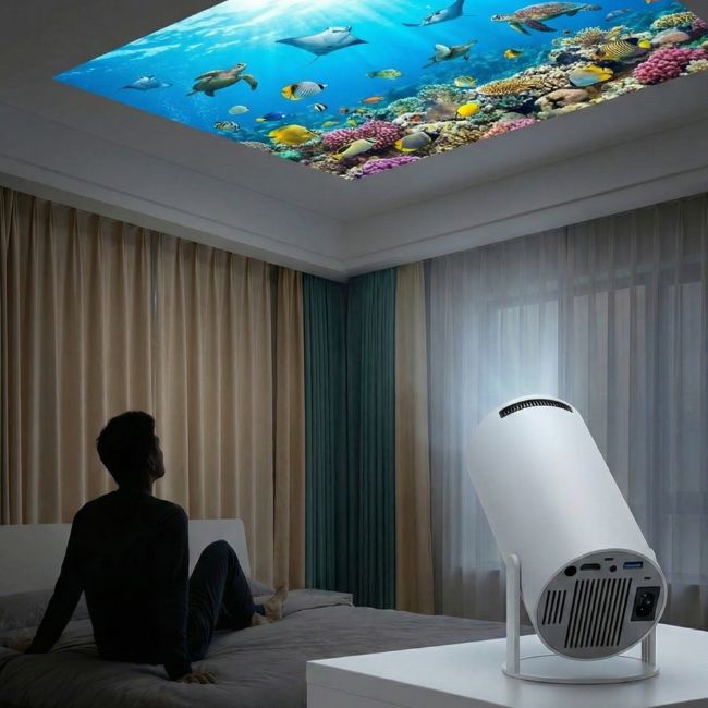 - Rotación 180º: Su soporte giratorio de 180º te permite proyectar en el techo, pared o suelo sin mover el proyector. 🔄